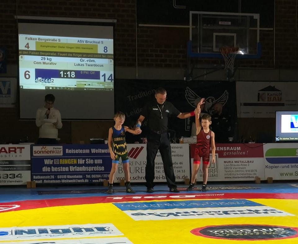 Bis 29 kg zeigte Cem Murafov eine starke Leistung. In einem spannenden und offenen Schlagabtausch behielt er die Nerven und konnte seinen Gegner schließlich auf Schulter besiegen – der Ausgleich war geschafft. 8:8 In der Klasse bis 31 kg konnten die Falken keinen Ringer stellen, wodurch Bruchsal kampflos Punkte einfuhr. 8:12